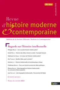 Revue d'histoire moderne et contemporaine supplément 2012-4bis Regards sur l’histoire intellectuellen° 59-4bis, 2012/5 - pagesPages 5 à 8Une nouvelle histoire intellectuelle ? Brève introductionPar Philippe MinardPages 9 à 28Histoire des idées, histoire sociale : l'exemple françaisPar Daniel RochePages 29 à 46Le retour de l'histoire intellectuelle, révolution conservatrice ou programme de relance ?Par Stéphane Van DammePages 47 à 64L'histoire intellectuelle : quelles idées, quel contexte ?Par Ann ThomsonPages 65 à 84Rabelais est-il notre contemporain ? Histoire intellectuelle et herméneutique critiquePar Antoine LiltiPages 85 à 104Plaidoyer pour une histoire sociale des idées politiquesPar Frédérique MatontiPages 105 à 130L'historiographie est-elle une forme d'histoire intellectuelle ? La controverse de 1934 entre Lucien Febvre et Henri JasseminPar Étienne AnheimPages 131 à 148Retour sur expérience : une biographie intellectuelle de l'économiste Wilhelm RöpkePar Jean SolchanyPages 149 à 151Ann Thomson,Bodies of Thought. Science, Religion and the Soul in the Early Enlightenment, Oxford, Oxford University Press, 2008, 320 p., ISBN 978-0199236190Par Karim GhorbalPages 151 à 154Gisèle Sapiro, La responsabilité de l'écrivain. Littérature, droit et morale en France (XIXe-XXIesiècle), Paris, Seuil, 2011, 750p., ISBN 978-2021032888Par Nicolas BeaupréPages 154 à 156Marc Joly, Devenir Norbert Elias, Paris, Fayard, 2012, 472p., ISBN 978-2-213-66678-5Par David RotmanPages 156 à 158Marie Scot,La London School of Economics and Political Science. 1895-2010, Paris, PUF, 2011, 344p., ISBN 978-2-13-058913-6Par Jérôme Tournadre